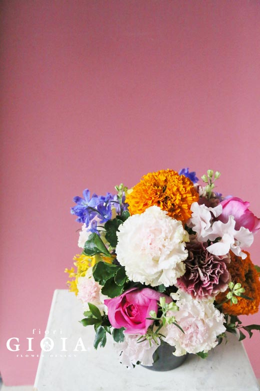 ・トルコキキョウ・デルフィニューム・バラ・スイートピー・カーネーション・エピデンドラム