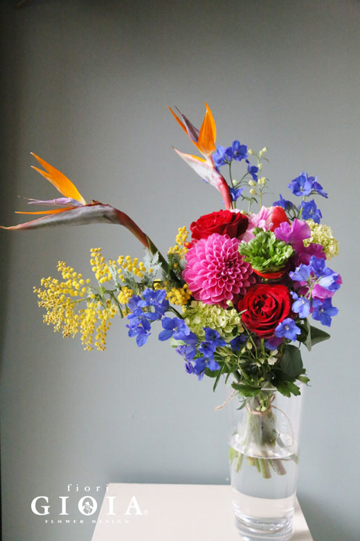 ・ダリア・赤薔薇・ストレチア・ミモザ・スイートピー・チューリップ・ラナンキュラス・ミニグリーン紫陽花