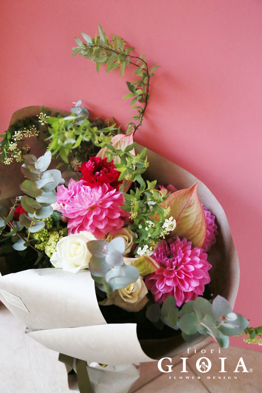 ・ダリア・ラナンキュラス・紫陽花・コデマリ・バラ・アンスリューム・ユーカリ