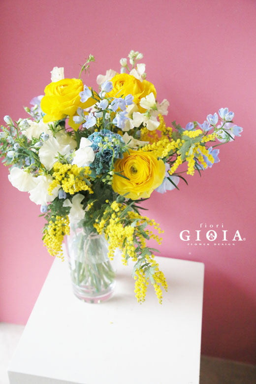 ・ミモザ・スイートピー・ラナンキュラス・デルフィニューム・カーネーション