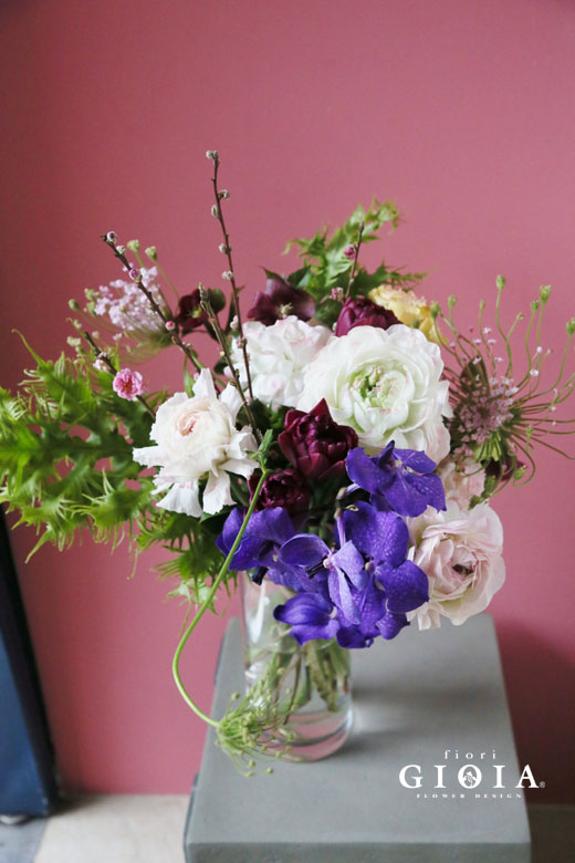 ・桃・チューリップ・ラナンキュラス・バンダ・レースフラワー